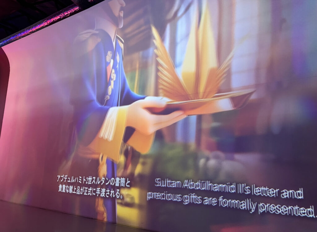 映像は子どもでも見やすいアニメ調。説明が難しくなりがちな歴史テーマも、 日本昔ばなしのような素朴なタッチで語られるので、親子でストレスなく物語に入っていけます。 さらに大画面の迫力が臨場感を後押し。物語の山場で来場者の視線と空気がピンと張るのを感じ、 「このテーマを家族で共有できる」という点がトルコ館の大きな価値だと思いました。