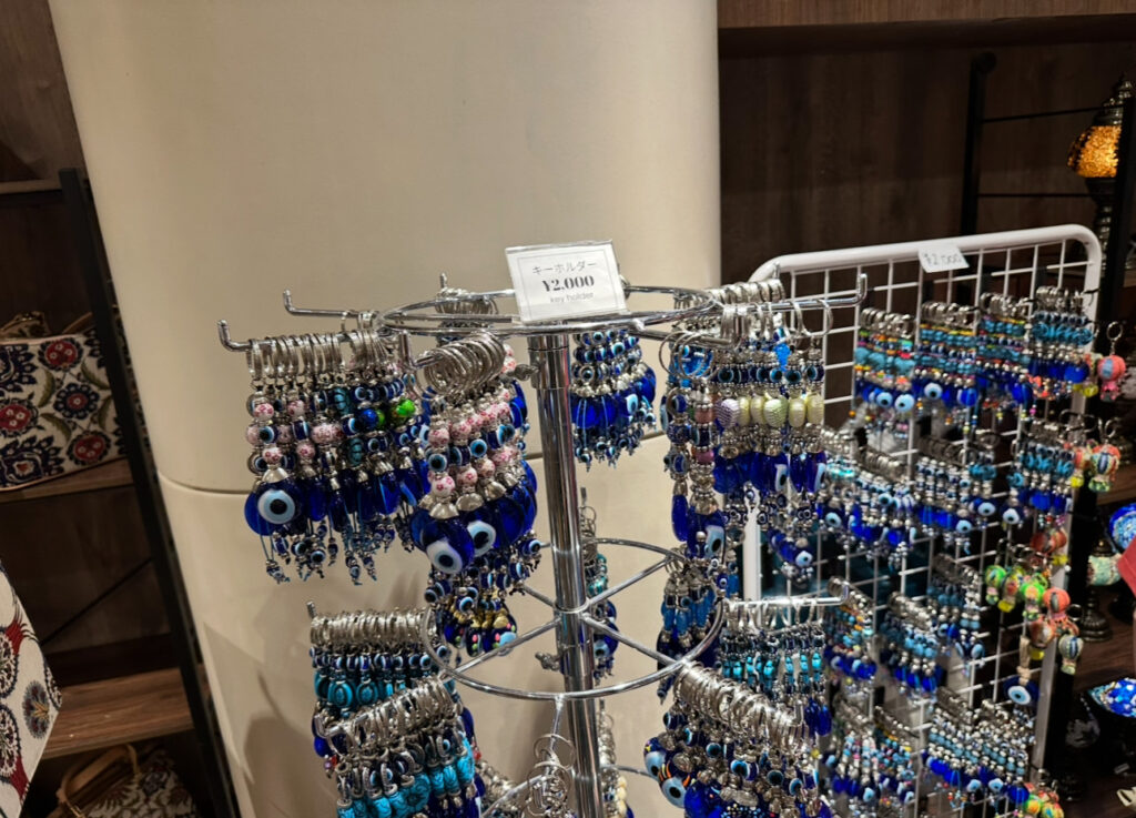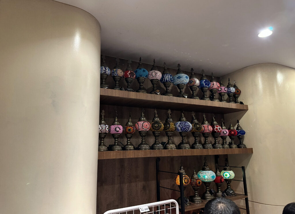 館内の随所でトルコらしい模様が目に入ります。気球や陶器の柄、トルコ絨毯の幾何学模様など、 ぱっと見で「トルコ」と分かるビジュアルが効果的。映像の余韻を壊さず、空間全体で世界観を支えていました。 物販コーナーにも陶器やバルーンといったアイテムが並び、“見て→感じて→持ち帰れる”体験導線が整っています(ショップは小さめで混雑しやすいので、立ち寄りは素早くが吉)。