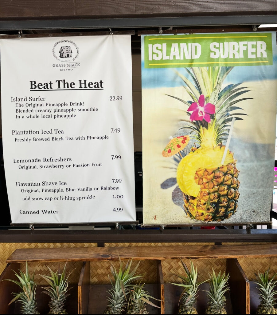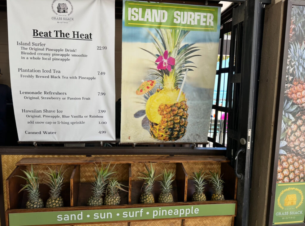 看板メニューは、丸ごとのパイナップルにストローが刺さったパイナップルジュース「Island Surfer」。