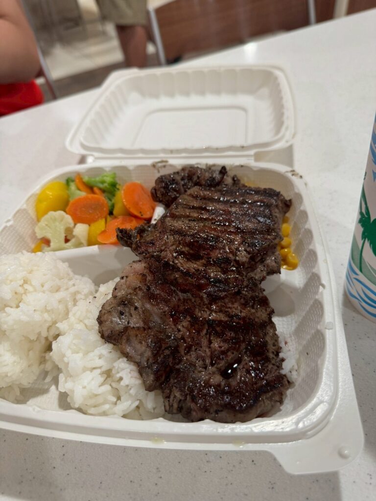 我が家が訪れたのは、テレビでも紹介された人気店STEAK&FISH COMPANY(ステーキ&フィッシュ・カンパニー)。ハワイらしいボリュームのステーキプレートを手頃に楽しめます。お肉は想像より柔らかく、塩コショウの効いた味付けがご飯にもぴったり。ぶれママも「テレビで見て気になっていたけど、想像以上においしい!」と満足していました。
