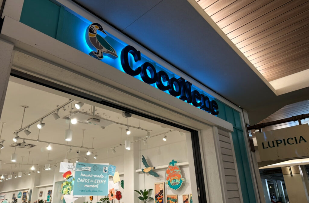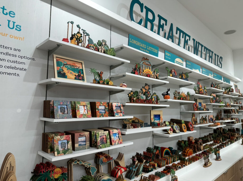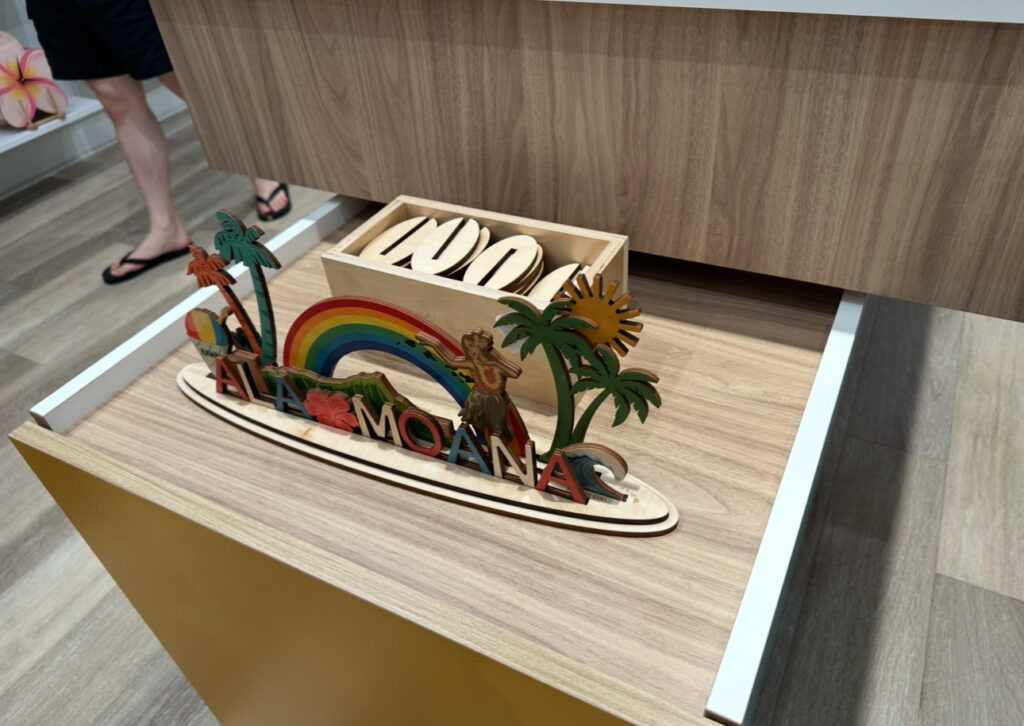最後に立ち寄ったのが、ハワイらしい雑貨ショップのCocoNene(ココネネ)。店内にはハワイアンモチーフのアートや木製オブジェが並び、ぶれ子も目を輝かせながら店内を歩き回っていました。ただ、興味津々で手を伸ばしてしまうので、目が離せません(笑)。