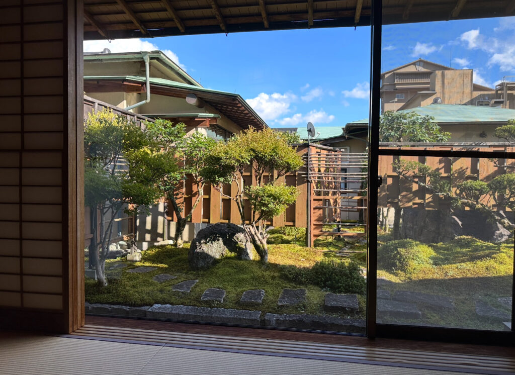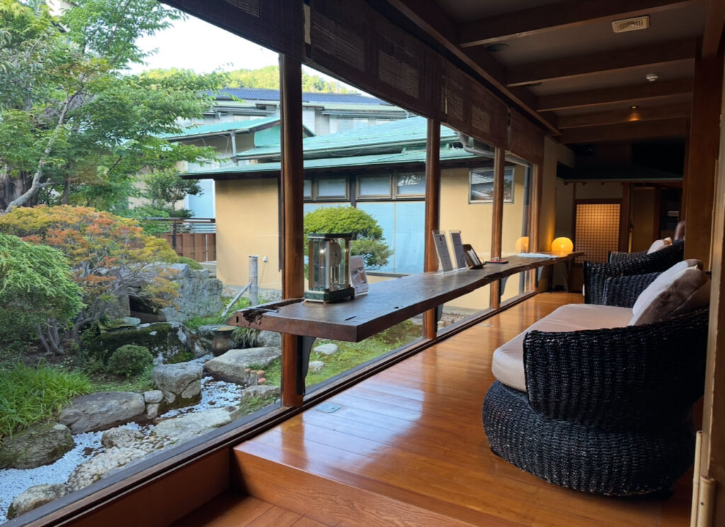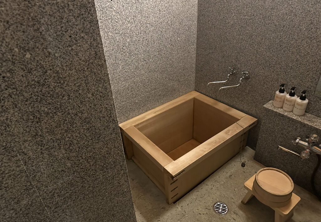 室内のお風呂はヒノキ風呂で、高級感が漂うつくり。木の香りがふわっと広がり、湯船に浸かると体の芯から癒やされるようでした。大きな窓から見える庭は細部まで手入れが行き届き、日常を忘れさせてくれる美しさがあります。障子や照明のデザインも繊細で、光の加減が柔らかく、写真に残しても絵になる空間でした。スタッフによる細やかな気配りも相まって、「ここで過ごす時間は特別だ」と強く感じるお部屋体験でした。