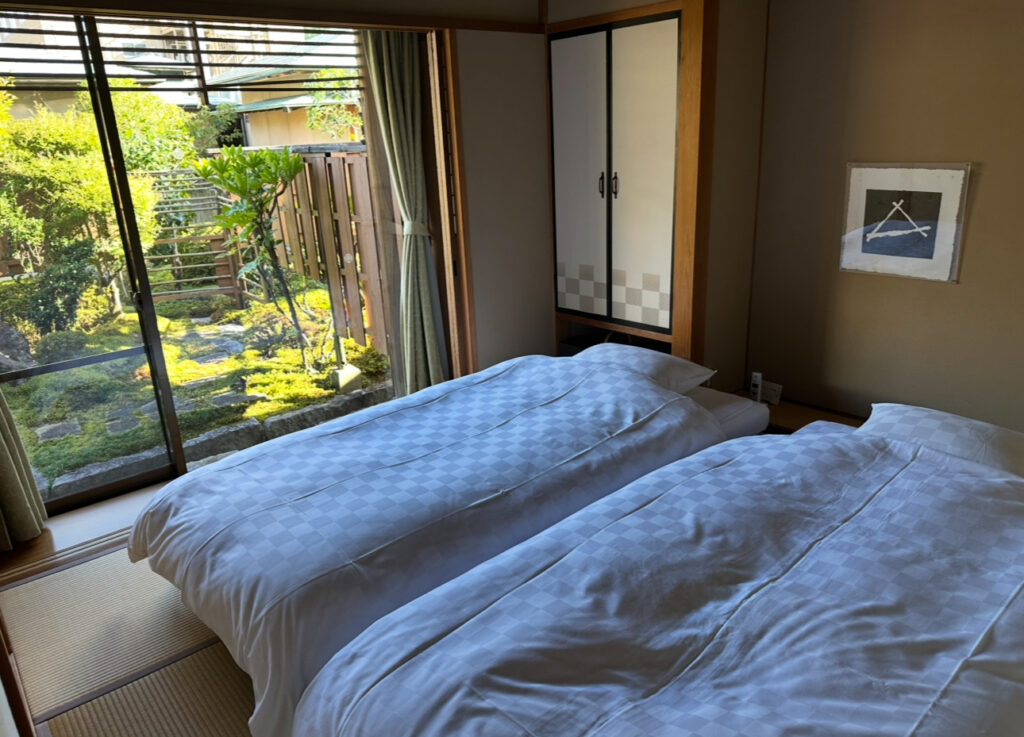 今回宿泊したのは和室タイプのお部屋。畳敷きの落ち着いた空間に、低めのベッドが2台、布団が2組という構成で、最大4世代でも十分にくつろげる広さがありました。窓の外には手入れされた庭が広がり、昼間は緑が美しく、夜には静かな空気に包まれます。名古屋から1時間余りで到着できる近場の温泉地でありながら、この非日常感は「石苔亭いしだ」ならではだと感じました。