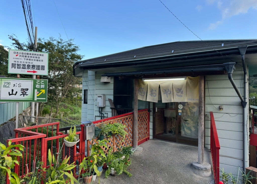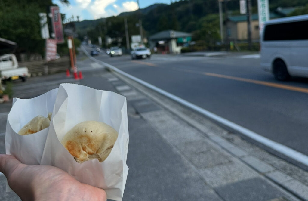次に立ち寄ったのはおやき工房えんまん。ネギ味噌とさつまいもバターを購入。さつまいもバターは子どもに人気と聞き、ぶれ子用に。どちらも皮がもちもちして食べやすく、大人も子どもも美味しくいただけました。店員さんが「どこの旅館?」と気さくに話しかけてくれ、「石苔亭いしだ」と答えると「高級旅館だね!」と大盛り上がり。温かい地元の雰囲気も楽しめました。