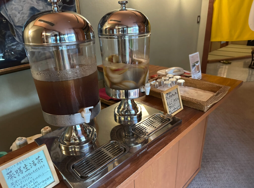 散策を終えて旅館に戻り、女性陣が温泉へ行く前に、ロビー横の休憩スペースで一息。ここでいただけたのが、名物のりんご水です。中庭を眺めながら飲む冷たいりんご水は、ほんのり甘く、さっぱりとして体に染み渡る味わいでした。