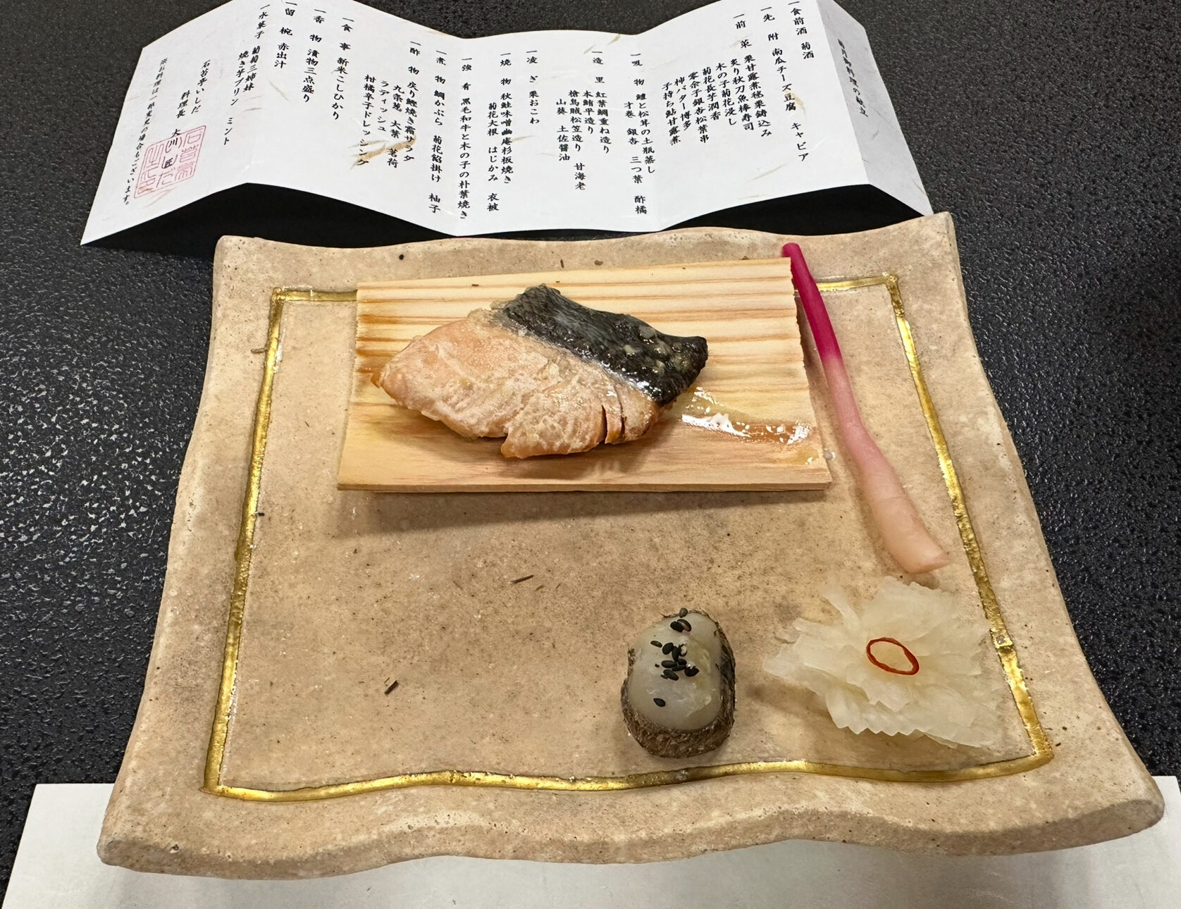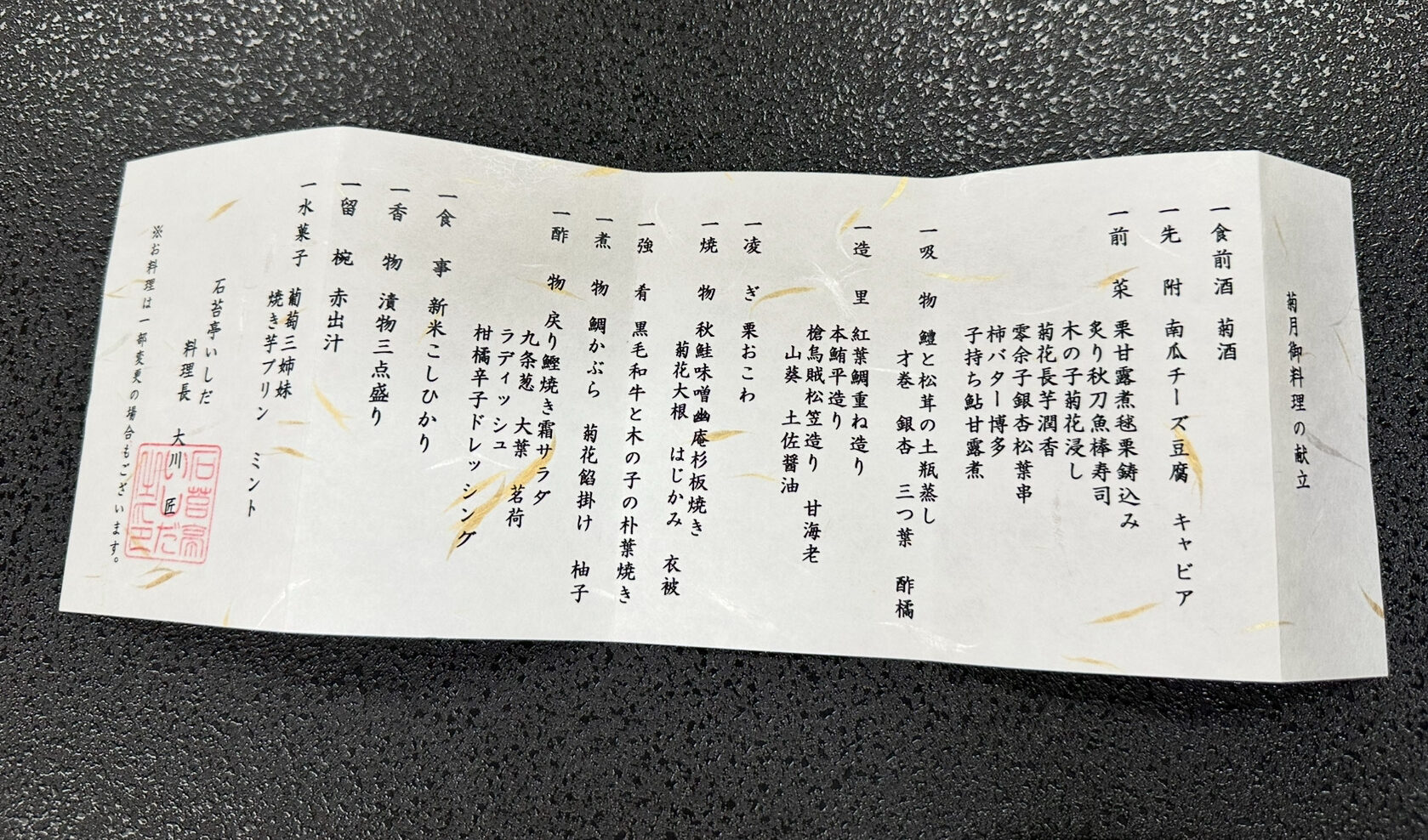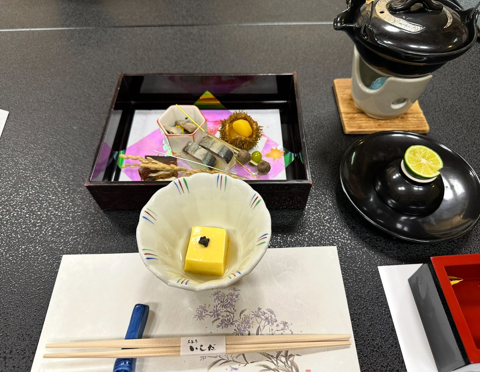 館内に一歩足を踏み入れると、漂ってくるのは日本らしいお香の香りで更に能舞台があり、他の旅館ではなかなか見られない独自の魅力。非日常感を演出する空間デザインは「特別な場所に来た」という実感を与えてくれました。チェックインを終えると、抹茶と茶菓子のウェルカムサービスが用意されており、家族そろってほっと一息。ぶれ子も大人用の椅子に深く腰掛け、満足そうにおとなしく座っていたのが印象的でした。こうした「家族全員が安心して過ごせる仕掛け」が随所にあるのも、石苔亭いしだの大きな魅力です。