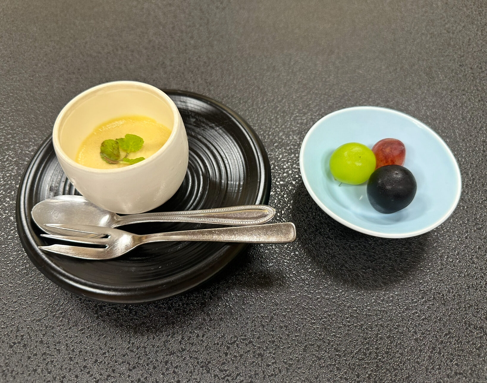 最後のデザートはプリンと旬のぶどう三姉妹。中でもクイーンルージュの上品な甘さが印象的で、翌日の朝市で母が購入するほど気に入った逸品でした。