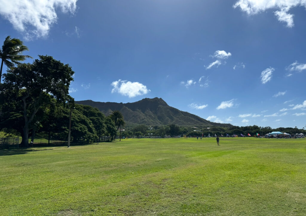 大きな芝生エリアとモンキーポッドの木が広がる風景はハワイらしさ満点で、ぶれ子も周りをキョロキョロして楽しんでいました。ただし、芝生の上はベビーカーの抵抗が大きく、少し重くなるため、できるだけ舗装された歩道側を歩くのがおすすめです。